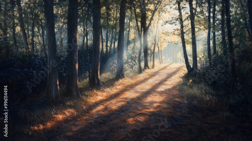 © Rere_Art151, Fototapeta premium Sunbeams Illuminate a Path Through a Dense Forest