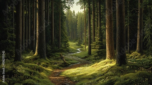 © Genta, Obraz premium Sunbeams illuminate a path through a lush forest, with green moss and a small creek.