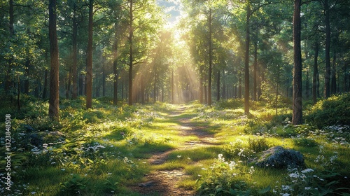 © harryaishi, Fototapeta premium Sunbeams illuminate a path through a lush green forest. (1)