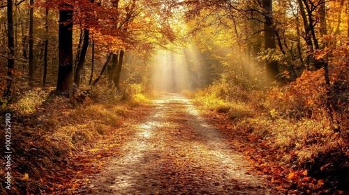 Obraz premium Sunbeams Illuminate a Path Through an Autumn Forest