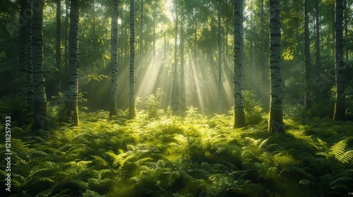 © hanif, Fototapeta premium Sunbeams illuminate a serene birch forest floor covered in lush green ferns.