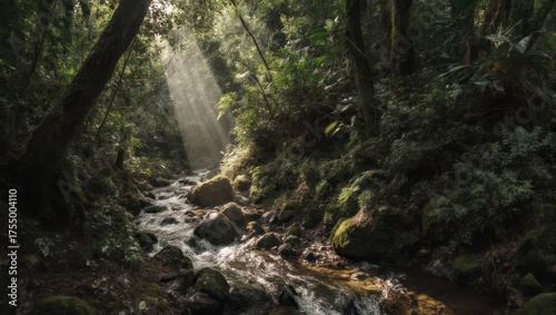 Obraz premium Sunbeams illuminate a serene stream flowing through a lush, verdant forest...