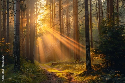 Naklejka premium Sunbeams illuminate a tranquil forest path at sunrise. Tall trees stand...