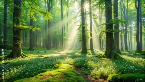 Fototapeta premium Sunbeams Illuminate a Verdant Forest Floor Carpeted with Delicate White...