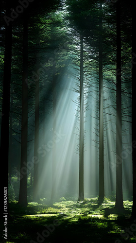 Naklejka premium Sunbeams Illuminate Dark Forest