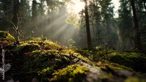 Fototapeta premium Sunbeams illuminate dense, moss-covered forest floor with tall tree trunks in...