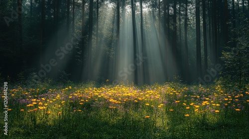 Fototapeta premium Sunbeams illuminate forest meadow wildflowers