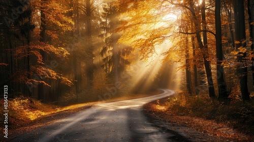 © The 2R Artificiality, Fototapeta premium Sunbeams illuminate forest road in autumn morning