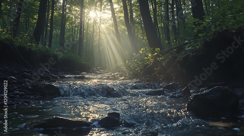 Obraz premium Sunbeams Illuminate Forest Stream Rocks And Trees