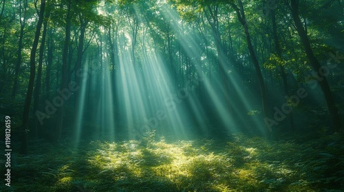 © Sri, Obraz premium Sunbeams Illuminate Lush Forest Floor, Creating a Magical and Peaceful Atmosphere