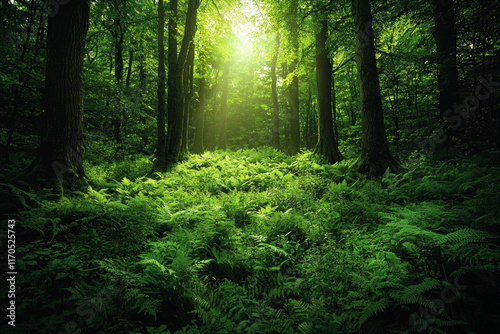 Obraz premium Sunbeams illuminate lush green ferns in a tranquil forest.