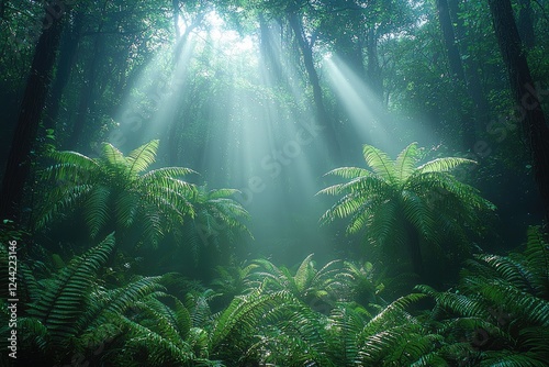 © boler, Fototapeta premium Sunbeams Illuminate Lush Green Forest Canopy