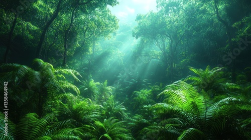 © bulegendut, Obraz premium Sunbeams illuminate lush green rainforest with ferns.