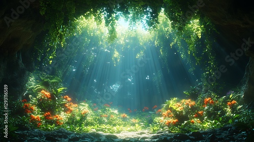 Fototapeta premium Sunbeams illuminate lush jungle cave flora