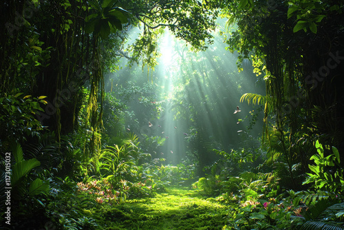 © AbdulHakim, Fototapeta premium Sunbeams illuminate lush jungle path with butterflies, moss, plants