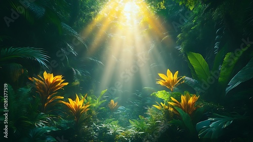 © Koncolawas, Obraz premium Sunbeams Illuminate Lush Tropical Jungle Foliage