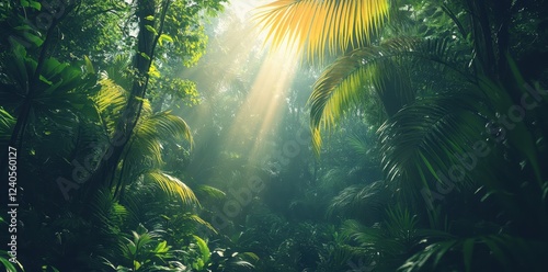 © NpicArt, Fototapeta premium Sunbeams Illuminate Lush Tropical Rainforest Canopy