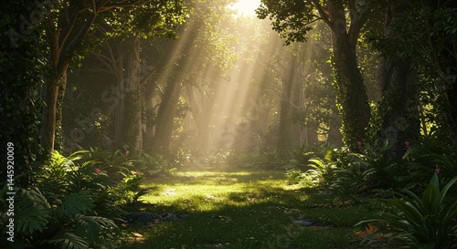 Obraz premium Sunbeams Illuminate Lush Tropical Rainforest, Tranquil Path Through Verdant...