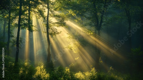 © Renof, Obraz premium Sunbeams illuminate misty forest.