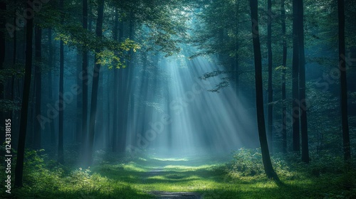 Fototapeta premium Sunbeams illuminate misty forest path