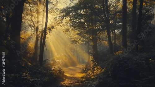 © Arc std., Fototapeta premium Sunbeams illuminate misty forest path.