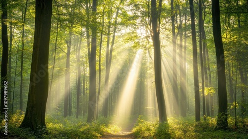 © Penatic Studio, Fototapeta premium Sunbeams Illuminate Misty Forest Path Through Trees