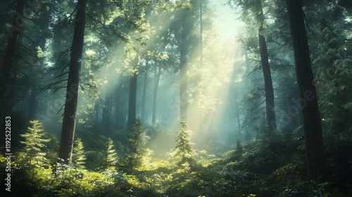 Obraz premium Sunbeams Illuminate Misty Forest Scene With Young Tree