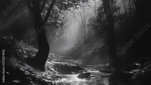 © Arc std., Obraz premium Sunbeams illuminate misty forest stream.