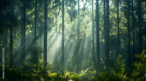 Obraz premium Sunbeams Illuminate Misty Forest Trees