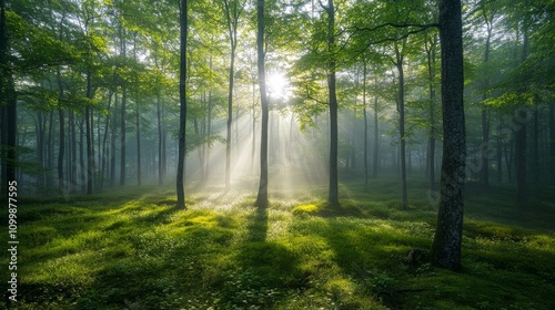 Fototapeta premium Sunbeams Illuminate Misty Green Forest Floor
