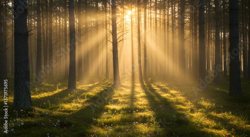 Obraz premium Sunbeams Illuminate Misty Pine Forest at Dawn