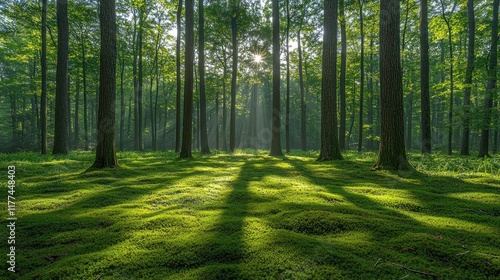 Obraz premium Sunbeams illuminate mossy forest floor at sunrise