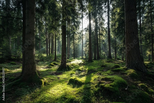 Naklejka premium Sunbeams Illuminate Mossy Forest Floor, Trees Stand Tall, Nature's Serene Beauty Unveiled