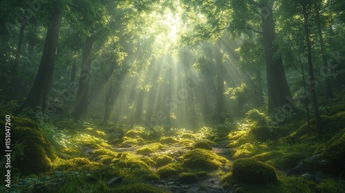 © Ali, Fototapeta premium Sunbeams illuminate mossy forest path.