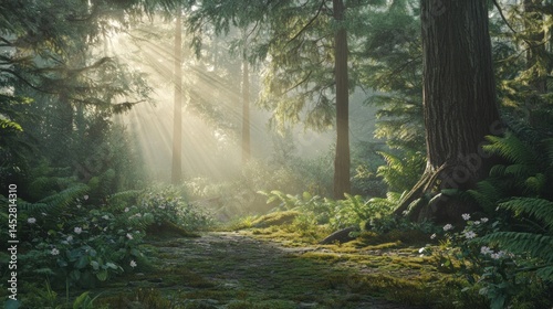 Naklejka premium Sunbeams Illuminate Mossy Forest Path
