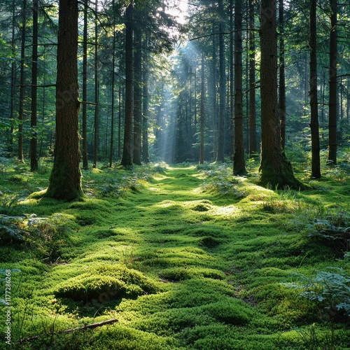 © Fiva, Obraz premium Sunbeams illuminate mossy path in tranquil forest at sunrise