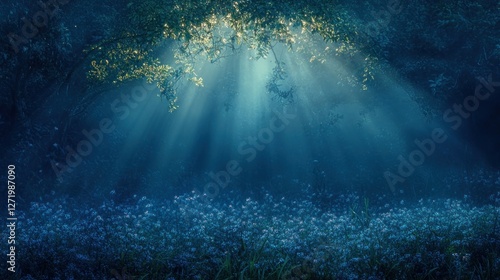 Obraz premium Sunbeams illuminate mystical blue forest, fantasy backdrop