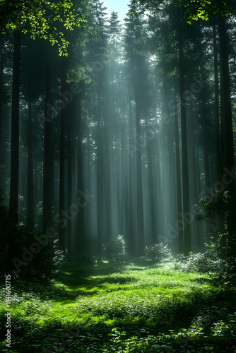 © Lailatul, Fototapeta premium Sunbeams Illuminate Mystical Forest Path.