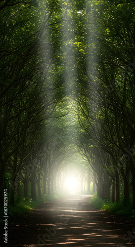 Obraz premium Sunbeams Illuminate Mystical Forest Path.