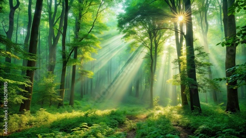 Obraz premium Sunbeams Illuminate Serene Forest Path, Lush Greenery Under Canopy of Trees,...
