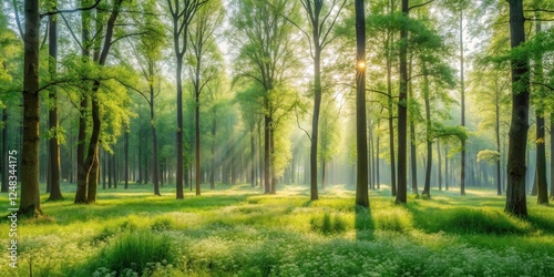 Obraz premium Sunbeams Illuminate Serene Spring Forest Meadow With Lush Greenery and...