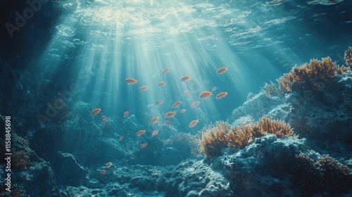 Fototapeta premium Sunbeams illuminate vibrant coral reef and fish. (3)