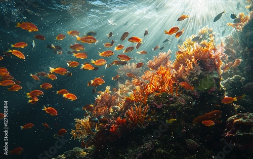 © mafaza, Naklejka premium Sunbeams illuminate vibrant coral reef and fish.