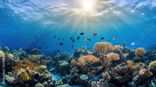 Fototapeta premium Sunbeams Illuminate Vibrant Coral Reef Ecosystem With Fish