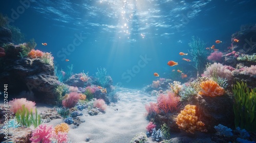 Obraz premium Sunbeams Illuminate Vibrant Underwater Coral Reef with Fish