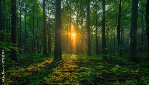 Fototapeta premium Sunbeams Illuminating a Dense Forest Floor