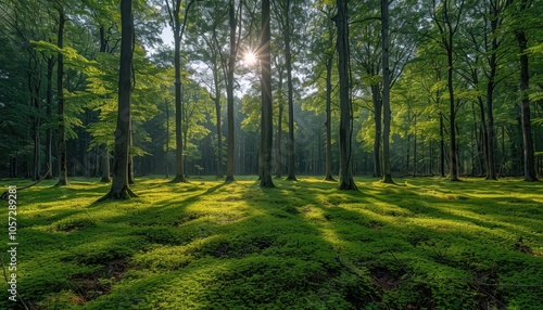 © boler, Fototapeta premium Sunbeams Illuminating a Dense Green Forest