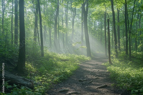 Fototapeta premium Sunbeams Illuminating a Foggy Forest Path