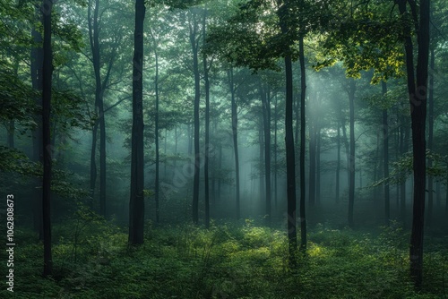 © novian, Obraz premium Sunbeams Illuminating a Foggy Forest Path