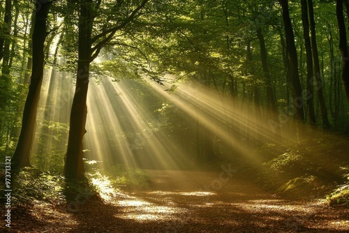 © Outkast, Obraz premium Sunbeams Illuminating a Forest Path